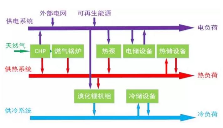 橫向來(lái)看依次是源網(wǎng)荷儲(chǔ)。源側(cè)包括常規(guī)的供電設(shè)備、CHP機(jī)組、燃?xì)忮仩t等設(shè)備,以及外部電網(wǎng)供電、可再生能源接入;網(wǎng)架分為冷熱電等傳輸系統(tǒng);荷側(cè)為園區(qū)內(nèi)部的電、熱、冷負(fù)荷;在儲(chǔ)能方面,不同能源子系統(tǒng)均有各自的儲(chǔ)能設(shè)備。縱向來(lái)看依次是電、氣、熱、冷多能互補(bǔ)運(yùn)行。不同的能源子系統(tǒng)分別用不同的顏色表示,多種能源轉(zhuǎn)化設(shè)備(熱泵、CHP、燃?xì)忮仩t、溴化鋰機(jī)組)將不同的能源子系統(tǒng)相耦合。園區(qū)內(nèi)部多種能源形式以虛擬電廠的形式組合在一起綜合運(yùn)行,在保證電、熱、冷負(fù)荷可靠供應(yīng)的前提下,實(shí)現(xiàn)了能源的梯級(jí)利用,提高能效,降低用能成本。并且對(duì)于波動(dòng)性很強(qiáng)的可再生能源而言,綜合能源系統(tǒng)具有更多的靈活性,促進(jìn)了可再生能源的接納,進(jìn)一步提高系統(tǒng)經(jīng)濟(jì)性。