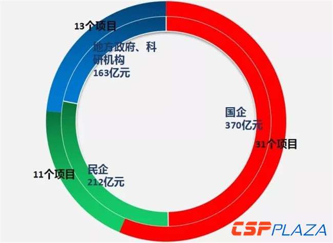 首批示范項(xiàng)目投資主體包括國(guó)企31家,投資金額370億元;民企11家,投資金額212億元;其他包括地方政府、科研機(jī)構(gòu)13家,投資金額163億元。