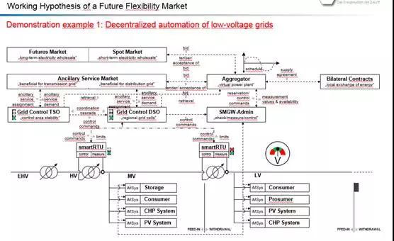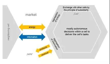 為了實(shí)現(xiàn)上述目標(biāo),必須在每個(gè)細(xì)胞結(jié)構(gòu)內(nèi)實(shí)現(xiàn)成熟的數(shù)據(jù)管理和安全防護(hù)系統(tǒng),對(duì)不同的信息、測(cè)量值、信號(hào)等進(jìn)行優(yōu)先排序和評(píng)估。如上圖所示,每一個(gè)細(xì)胞都已經(jīng)置身于能源市場(chǎng)中,在一個(gè)細(xì)胞里的所有互動(dòng)都是符合市場(chǎng)規(guī)律的。每一個(gè)細(xì)胞都向市場(chǎng)提供整合的信息,例如,每一個(gè)細(xì)胞能向市場(chǎng)提供多大的靈活性,從而作為可以在系統(tǒng)輔助服務(wù)市場(chǎng)出售的產(chǎn)品。相應(yīng)地,市場(chǎng)也會(huì)向每個(gè)細(xì)胞提供激勵(lì),例如通過(guò)價(jià)格信號(hào)?;诖耍總€(gè)細(xì)胞都可以自我決策,決定如何參與市場(chǎng),如何通過(guò)市場(chǎng)交易提供怎樣的產(chǎn)品。而每出售出一個(gè)電力產(chǎn)品,細(xì)胞也可以獲得相應(yīng)的收益,從而提高了流動(dòng)性。通過(guò)購(gòu)買(mǎi)價(jià)格最低的輔助服務(wù)產(chǎn)品,細(xì)胞內(nèi)部的購(gòu)買(mǎi)方也可以降低成本。