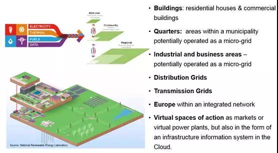 一個(gè)“細(xì)胞結(jié)構(gòu)”的基本功能是為位于其中的用戶(hù)供應(yīng)能源,將來(lái)還需要進(jìn)一步開(kāi)發(fā)供能系統(tǒng)的靈活性。而多能互補(bǔ)(電,熱,交通等)可以實(shí)現(xiàn)一個(gè)細(xì)胞結(jié)構(gòu)內(nèi)的整體優(yōu)化。該細(xì)胞結(jié)構(gòu)可以通過(guò)分布式能源、生產(chǎn)者與消費(fèi)者之間的互動(dòng),應(yīng)對(duì)電網(wǎng)日益增長(zhǎng)的復(fù)雜性。能源流和IT設(shè)施將不同基礎(chǔ)元素連接起來(lái),保證信息和能源的安全流動(dòng)互通。