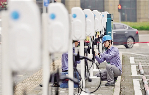 海寧加快建設(shè)充電樁,助推綠色出行。圖為工作人員檢查充電樁?!⊥踺W辰攝